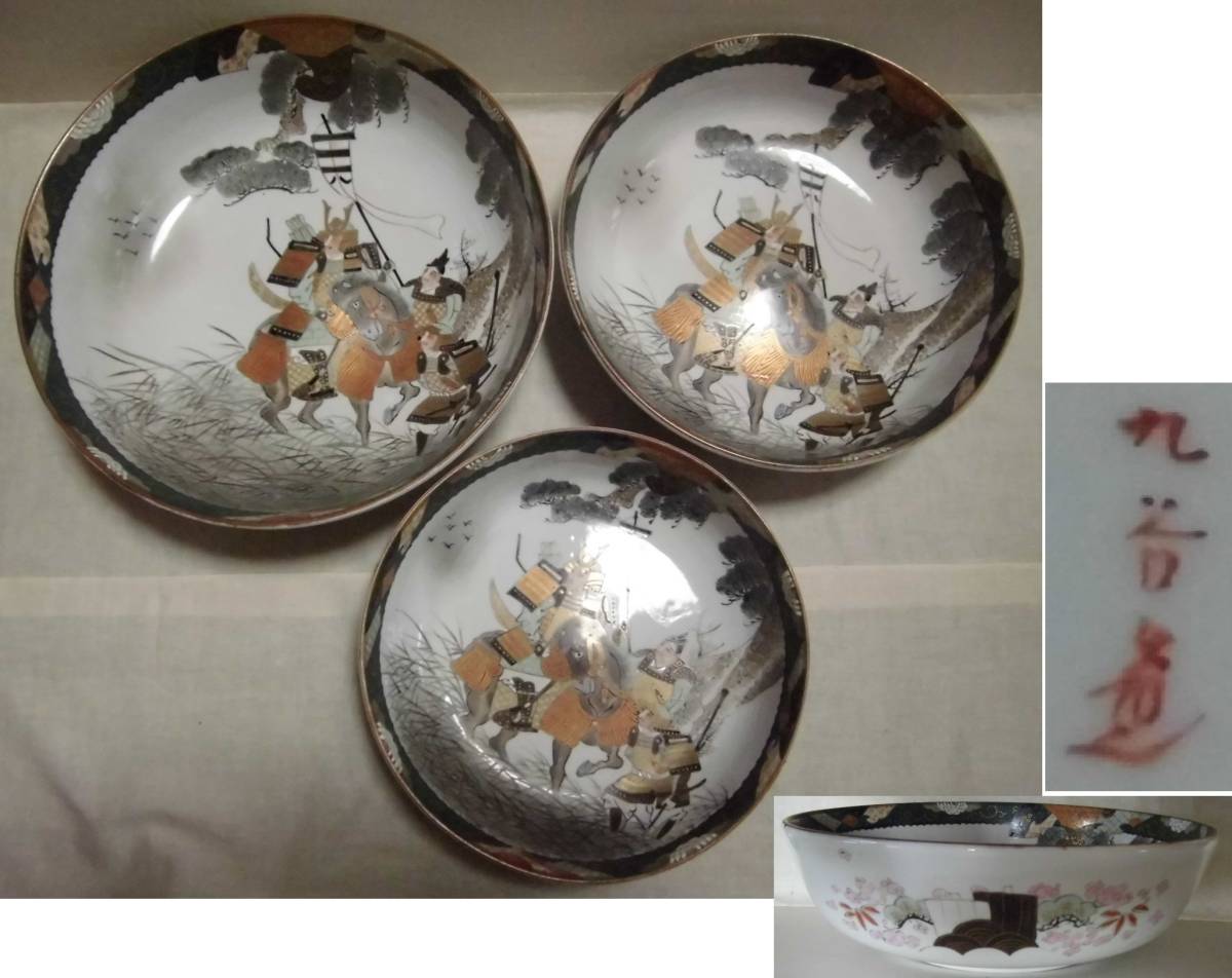 - 古い 九谷焼 大鉢 飾鉢 大中小 三つ揃え 盛鉢 計3点 九谷造 武者絵 金彩 青粒 30.5cm 絵鉢 馬に武将 鎧兜 三ツ揃え 陶器 工芸品 レトロ