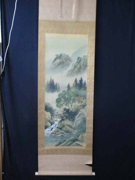 - ★掛軸 彩色山水 ※汚れ・下部に破れあり 縦188.5cm 横54.5㎝ さくら-115★