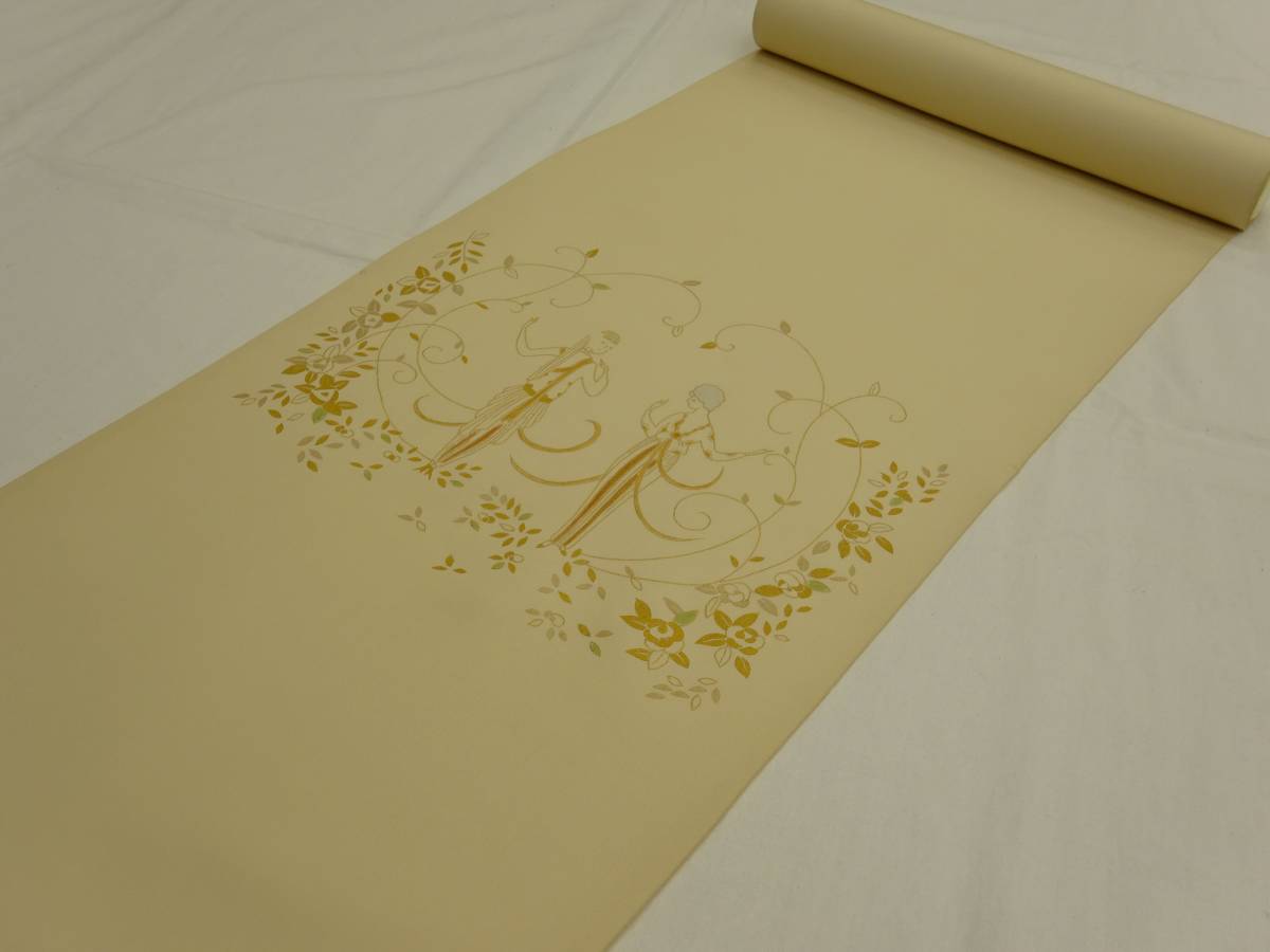 > 新品・未仕立て★京友禅・塩瀬染帯★薄ベージュ地に女神柄です