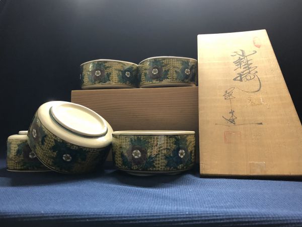 - 未使用品★ 九谷焼 角福銘 小鉢 5客 花柄 手塗りの綺麗な絵 共箱あり管理1801 H-3