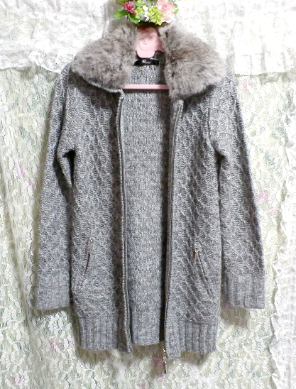> 灰色グレーラビット毛皮襟ファーセーター風カーディガン/アウター Gray rabbit fur collar fur sweater style cardigan/outer