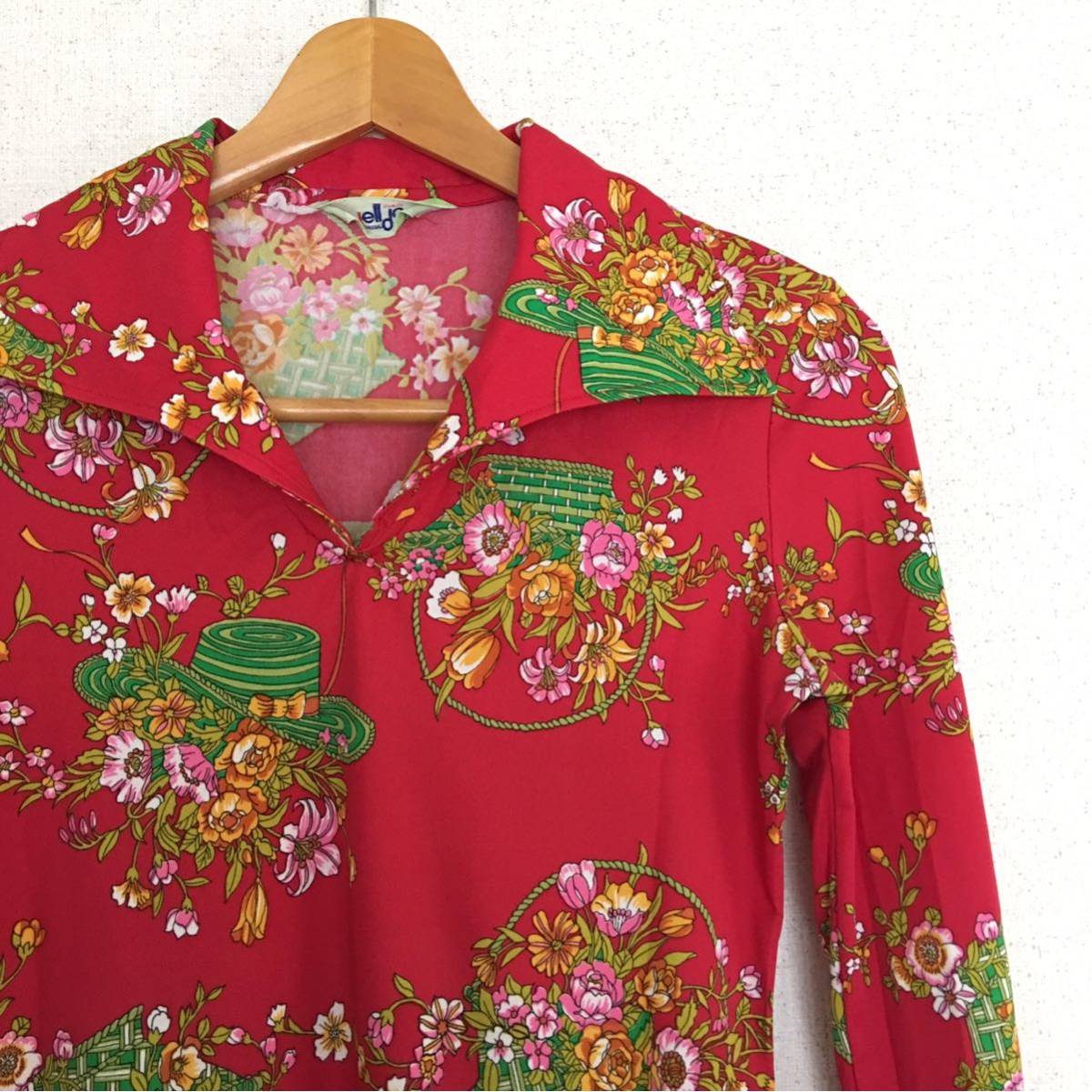> ビンテージ 70s【薔薇】総柄 ポリシャツ 古着 長袖 レトロ サイケデリック 柄シャツ ヒッピー ローズ柄 アンティーク ロック アメカジ 花柄
