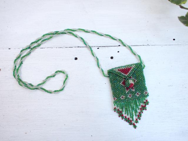 - バリ島面白雑貨*ビーズのポーチネックレス*グリーン:E☆お守り・匂い袋などに