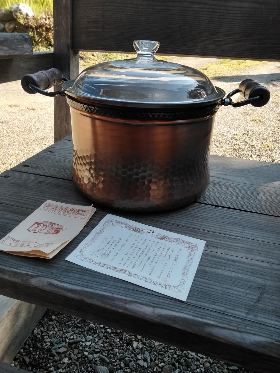 - 銅製鍋直径21㌢高さ約16㌢木製持ち手 保管品未使用 新潟の杉山金属株式会社製