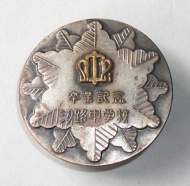 - 昭和 レトロ 校章 バックル 汐路中学校 卒業記念品 愛知県 名古屋 金属製 学校 中学生 ベルト 記章 ビンテージ アンティーク