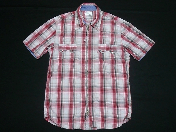 - 美品LEVISリーバイス[RedTab]半袖フロントジップウエスタンシャツM(38)赤x灰