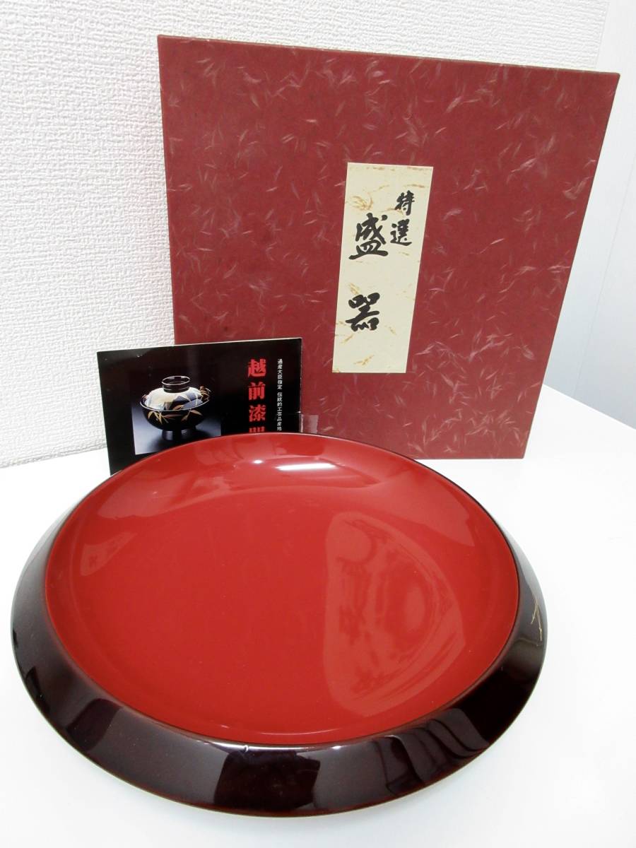- 極美品■越前漆器 盛器 木製 8寸 鉄鉢 溜内朱松葉 盛鉢 箱入り 管理1906 H-5