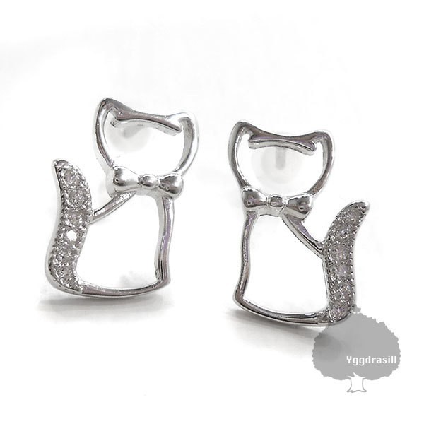 > YGG★新品 猫 キャット cat 石入り ピアス ペア 透かし シルバー925 両耳 ジルコニア プレゼント レディース