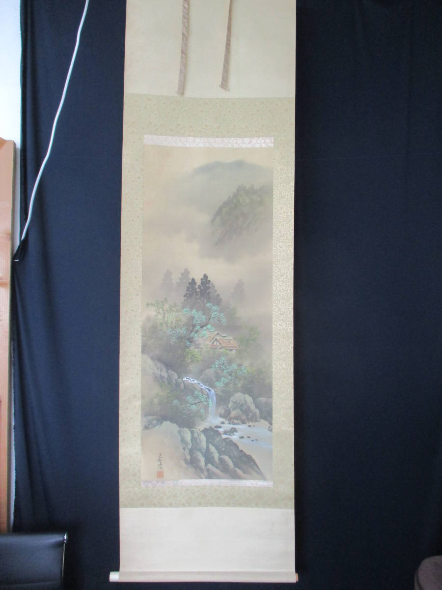 - ☆掛軸 青緑山水 木箱 縦187cm 横54cm 汚れシミ・方軸なし ラン-7☆