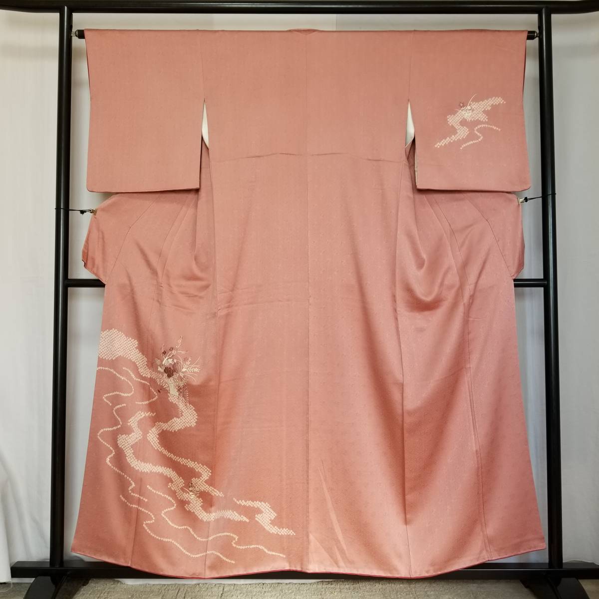 - 【桐徳】付下げ☆送料無料*手絞り流水{正絹*袷仕立*付下げ}*身丈160-裄64*オ-ルドロ-ズ色地*微細-手刺繍の花と.手絞りの流水文様*№4101