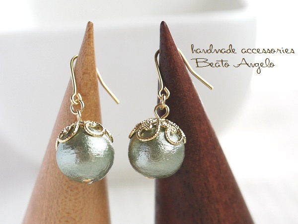 > ◆+angelo+コットンパールの一粒ピアス(p-374)ライトグリーン G 花座 10mm シンプル チタン 樹脂 イヤリング