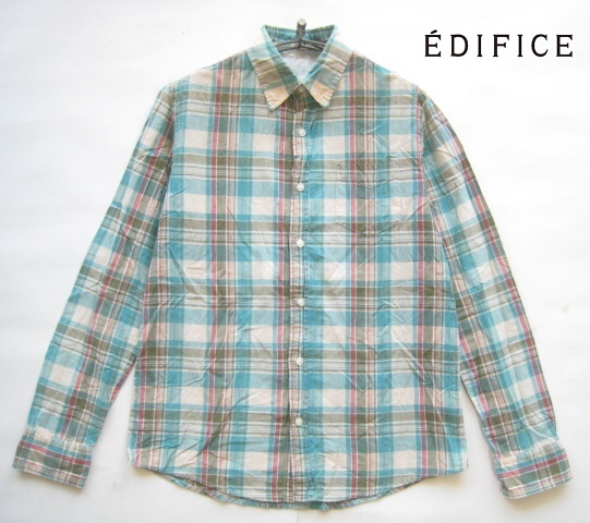 > 激シブ!!エディフィス EDIFICE*マドラスチェック柄長袖シャツ M グリーン×ベージュ×カーキ×ピンク