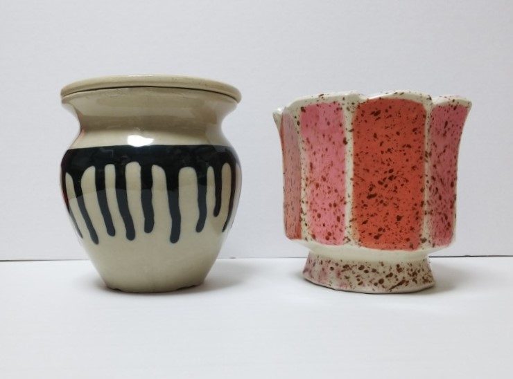 > 80s ①壷 灰色×青 釉薬かけ流し模様 蓋付き+②鉢 赤 側面10面 日本製※USED/ヴィンテージ/稀少/味わい/詳細不明/壷の底に1カ所欠けあり