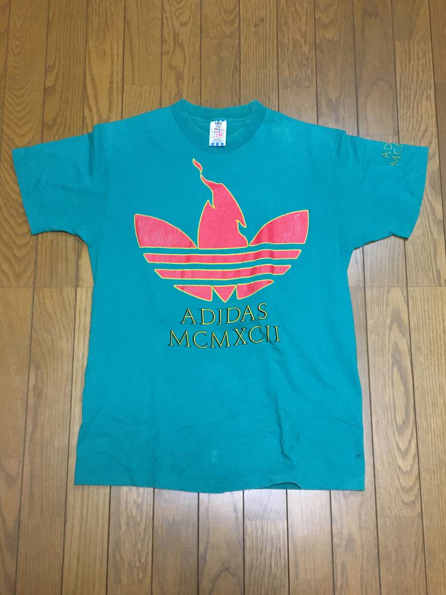 > レア ビンテージ USA製 90s adidas アディダス Tシャツ M トレフォイルロゴ 聖火 オリンピック 緑x赤 ヴィンテージ vintage オールド90年代