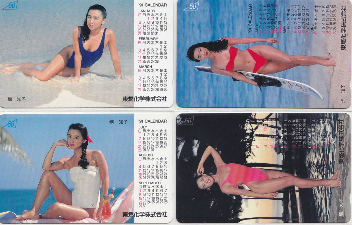 > 畑知子 東燃化学 '91カレンダー/ハイレグ水着【テレカ】4種完セット R2.8.17 ★送料最安60円~