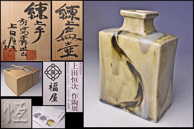 > 上田恒次 ★ 練上扁壷 ★ 共箱栞 ★ 希少作 ★ 掻き銘あり ★ 師: 河井寛次郎 ★ 洛北木野皿山窯 ★