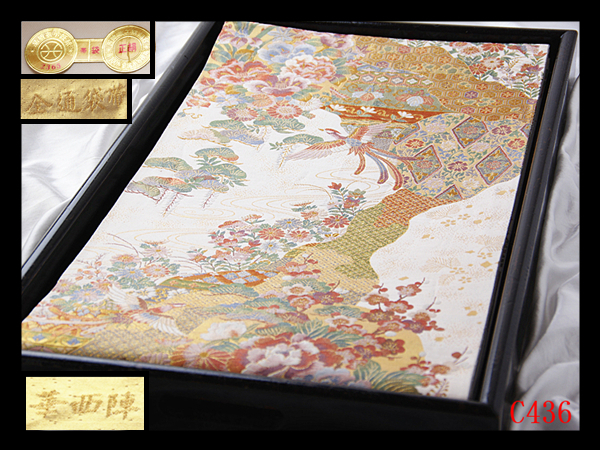 - C436厳選西陣 やまひで謹製 絵画のような繊細な織味 花鳥吉祥文様 ベージュ地 全通高級美術袋帯 ◇検◇簪名古屋帯締め