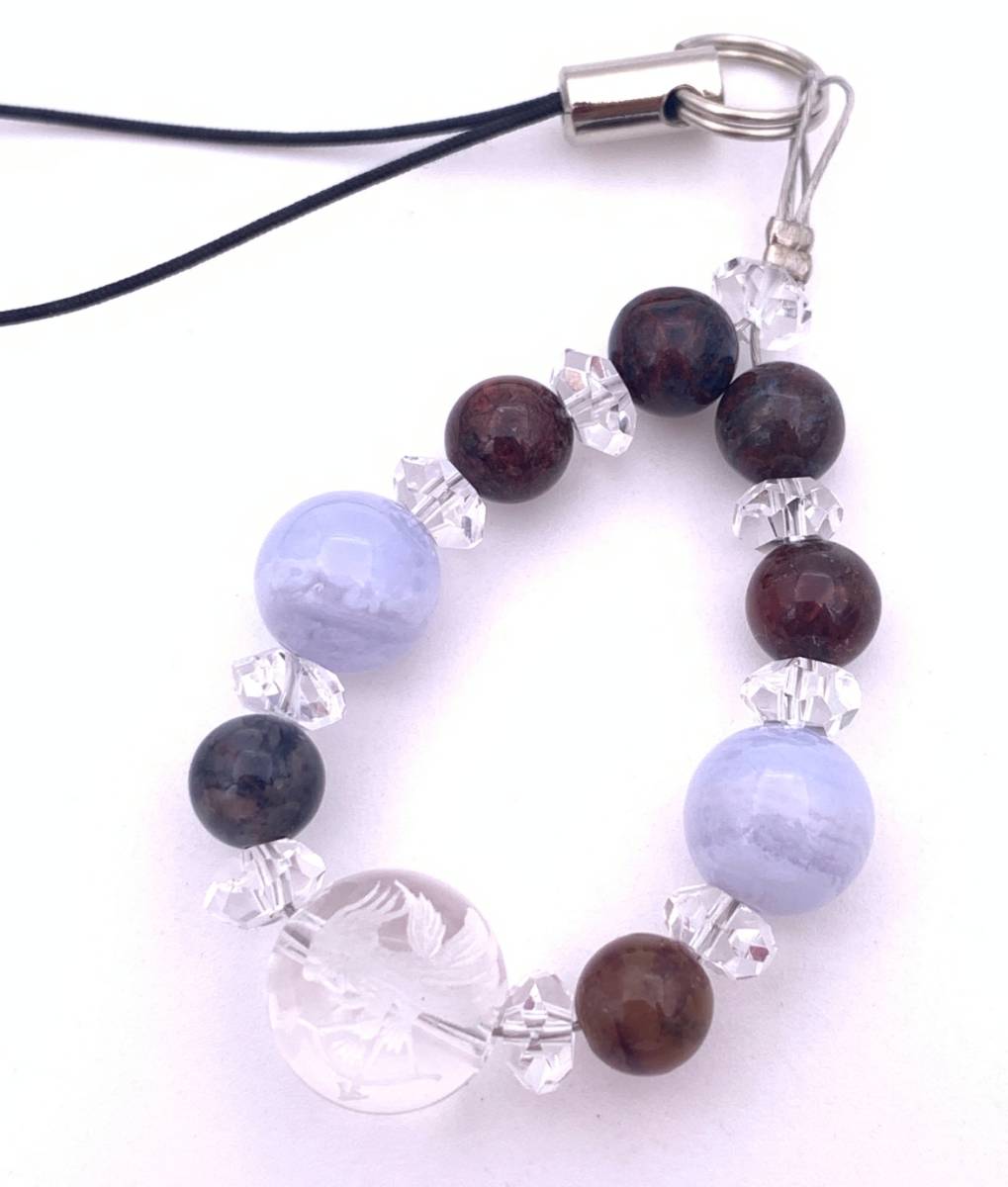 - 天然石彫り水晶10mm玉☆弓持ち天使-エンジェル&ピーターサイト&ブルーレースのストラップ