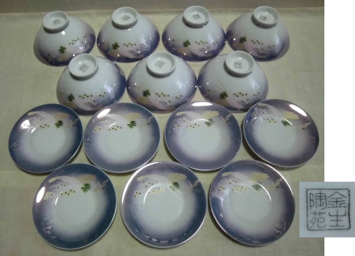 > ご飯茶碗 7客 小皿 7枚 金生陶苑 鶴柄 計14点セット ラスター 光沢 飯器 食器 陶器 工芸品 レトロ アンティーク