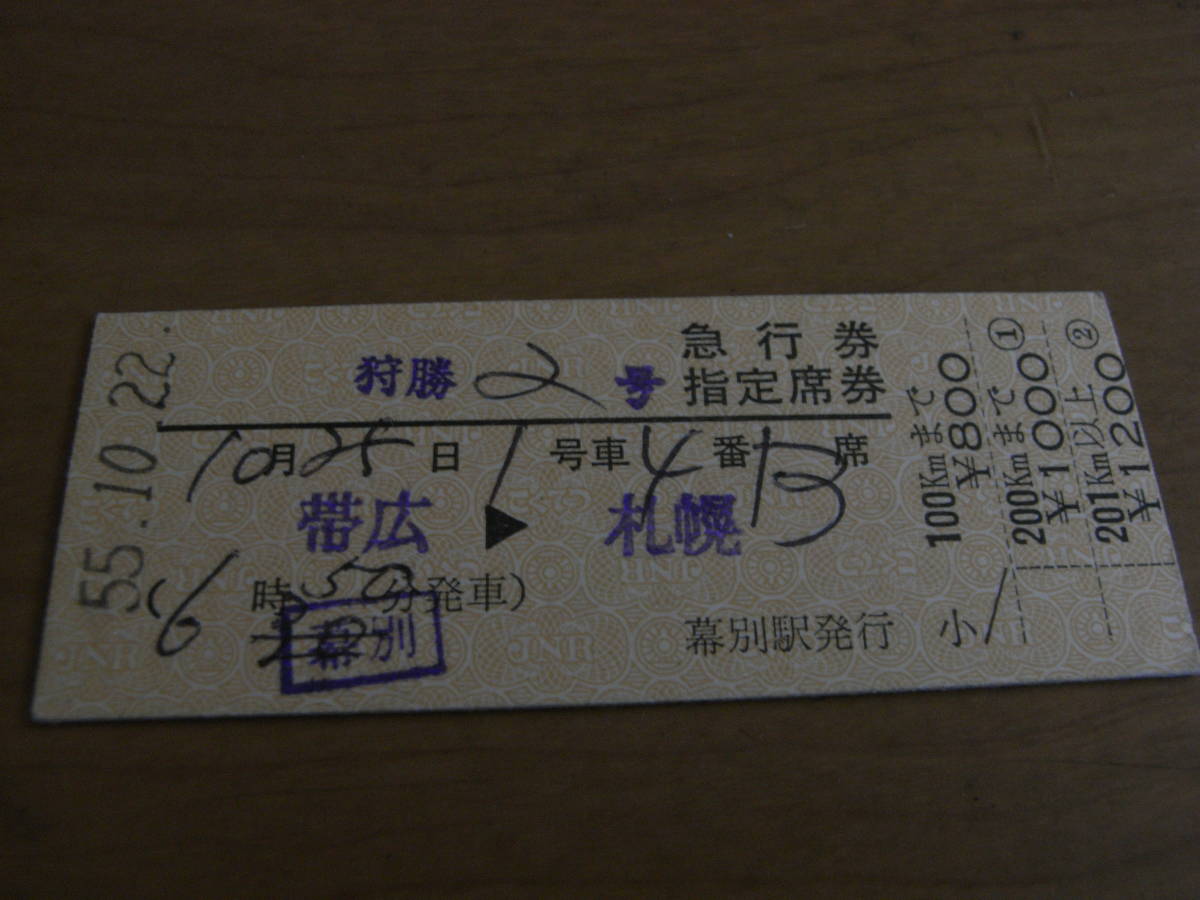 - 狩勝2号 急行券 指定席券 帯広→札幌 昭和55年10月22日 (根室本線)幕別駅発行