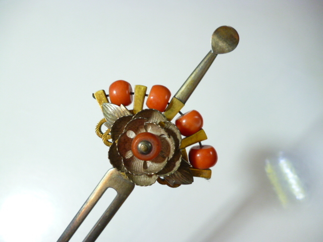 - ф 彫金花細工 本珊瑚飾り 簪 ф かんざし 珊瑚