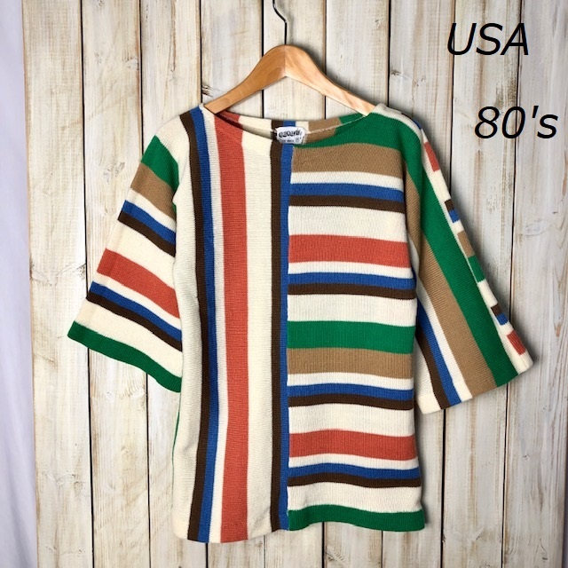 - USA古着 80's~ オールド フレア袖マルチボーダー ストライプセーター M アメリカ古着 ヴィンテージ ●3