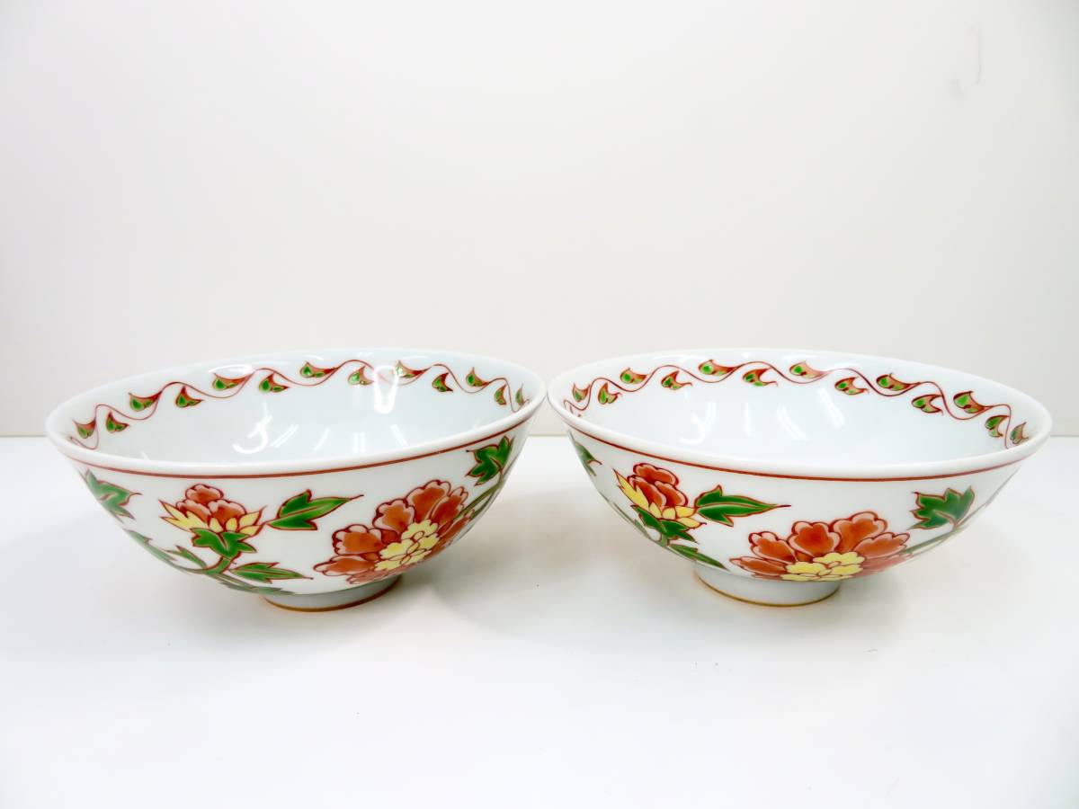 - ▲手塚玉堂作 ご飯茶碗 飯碗 色違い 花 銘あり 2客セット 極美品 管理2011 Z-2