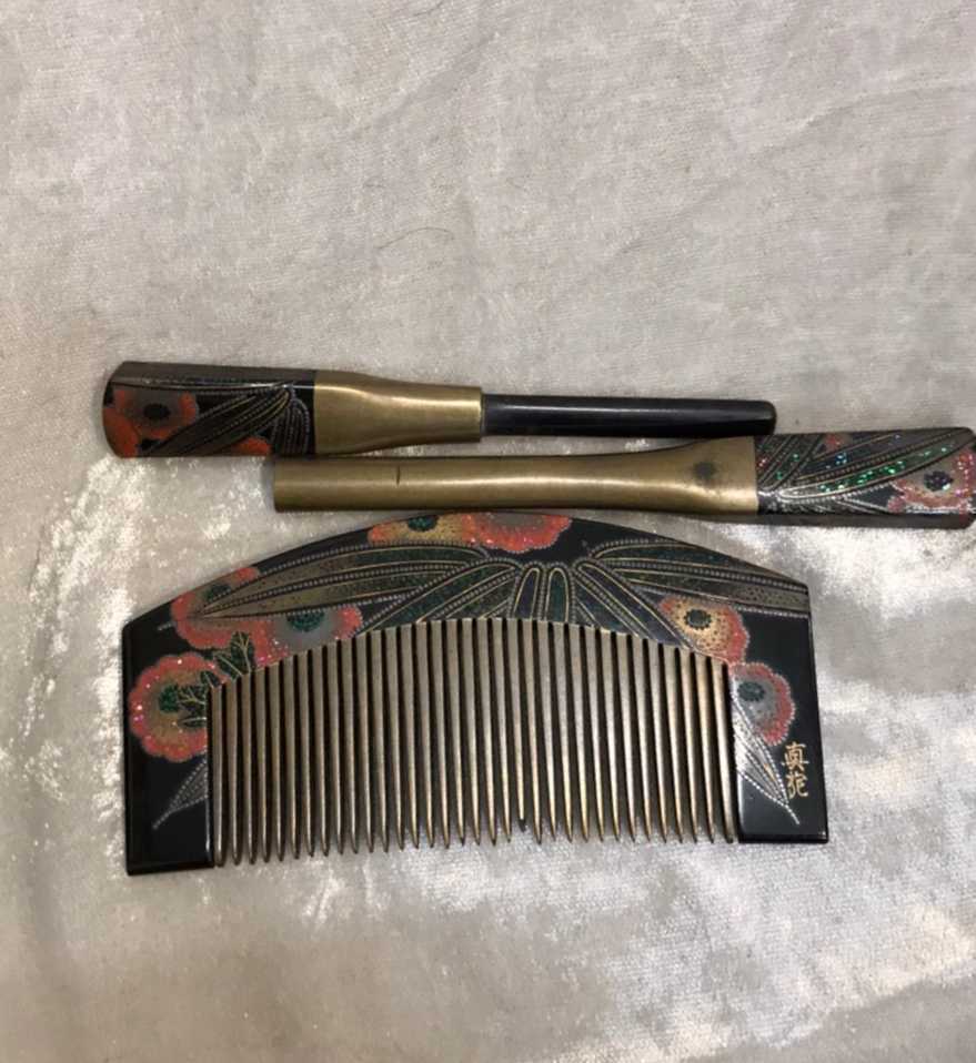 - 【帯留・かんざし】櫛と笄のセット 蒔絵 笹に菊文 貝象嵌 銘あり 和装小物 骨董品 アンティーク