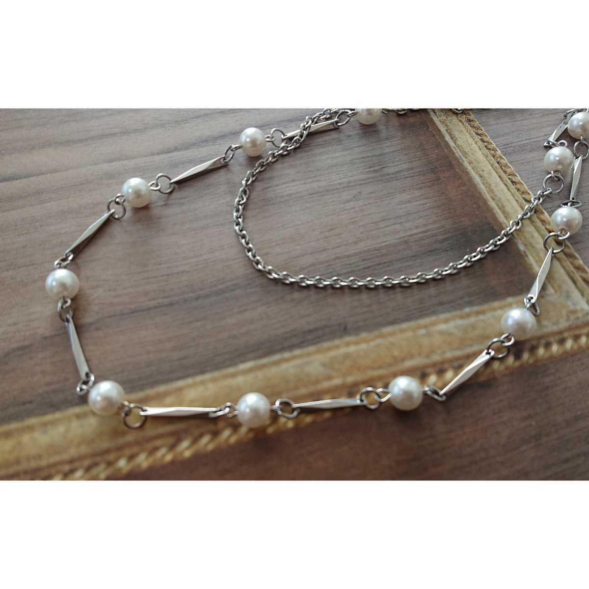 - □涼し気な印象□パールビーズ×シルバーカラーチェーンのロングネックレス□