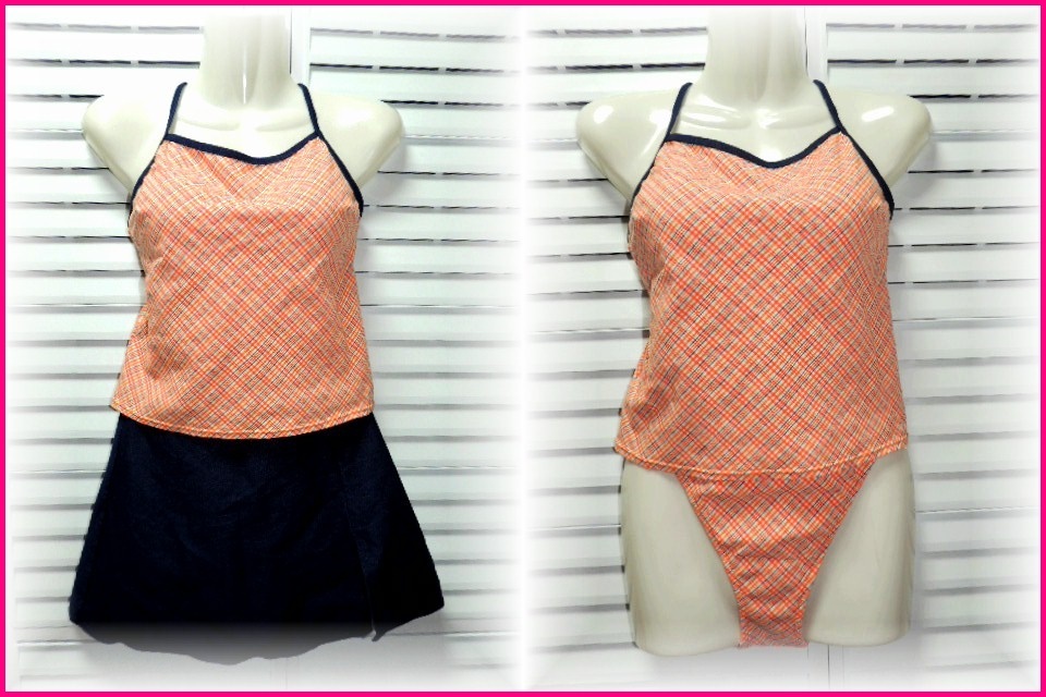 - Nikki 日本製 セパレート水着 デニム風スカートセット 11号/L ホワイト地×オレンジチェック柄