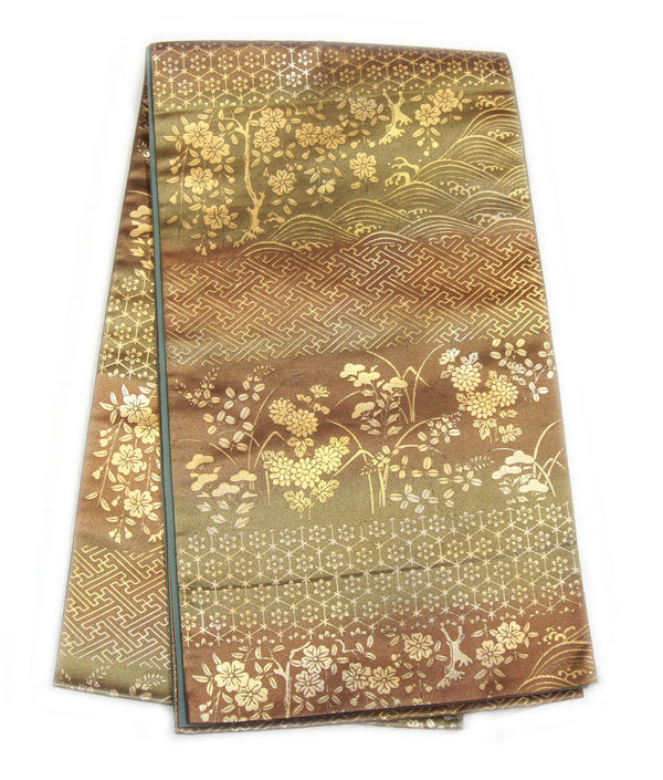 - 中古 安心価格 袋帯 正絹 茶 金 花 六通 小物付き