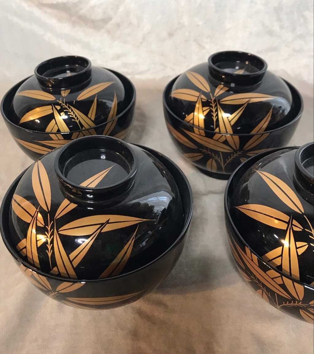 - 【漆器・蒔絵】蒔絵笹の葉紋吸物椀 四客セット 五枚笹 骨董品 アンティーク