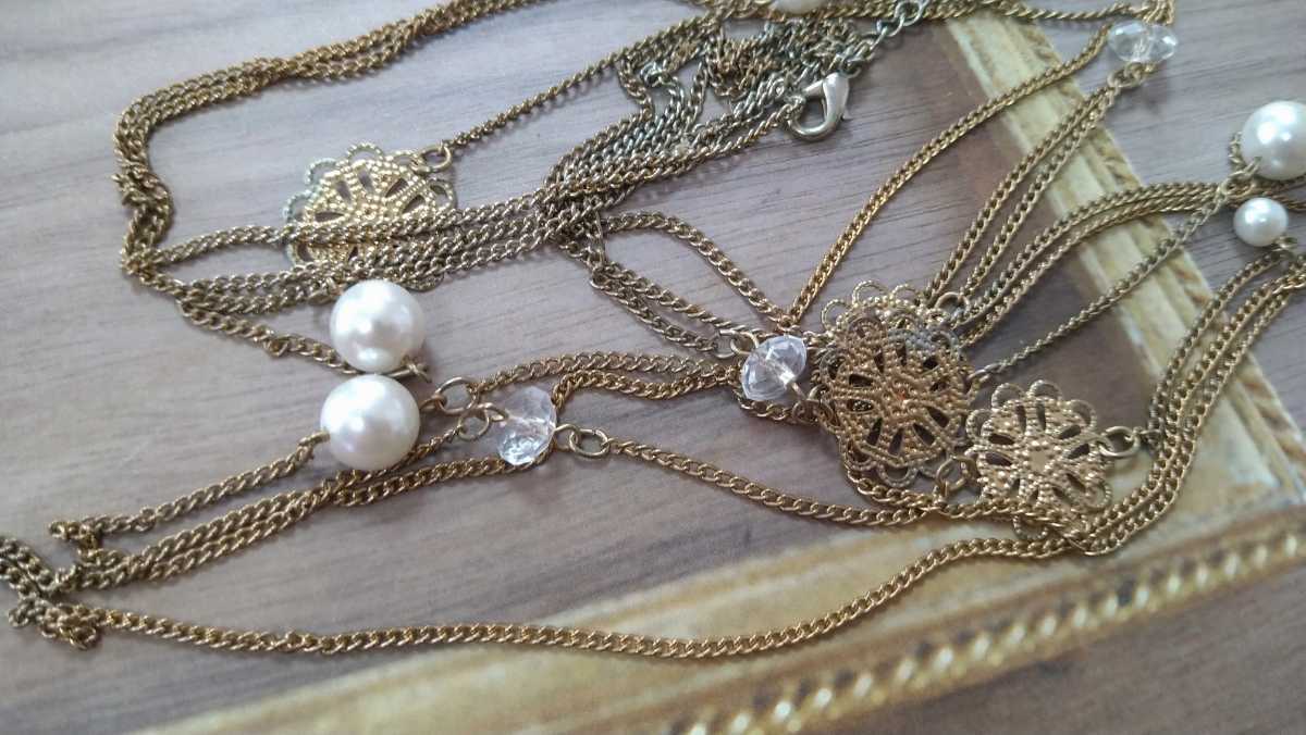 - □訳あり□3連ロングネックレス□パールビジュー・ラインストーン・透かし模様□