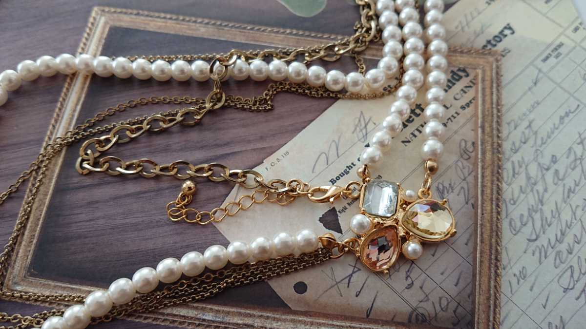- □エレガントな印象□クリア・イエロー・ピンクビジュー&パールビーズのハーフ4連ロングネックレス□