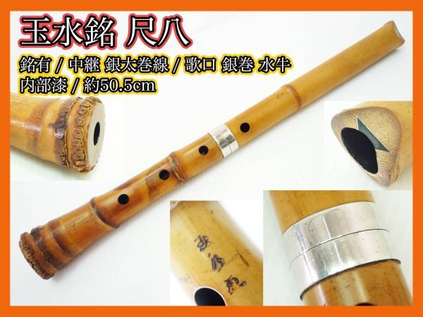 - 玉水 銘有 尺八 河野 銀太線巻 銀継 歌口銀巻 水牛 銘入 在銘 竹製 色艶 高級感 約50.5cm 内側漆 伝統 雅楽 マニア必見 コレクター_BB11