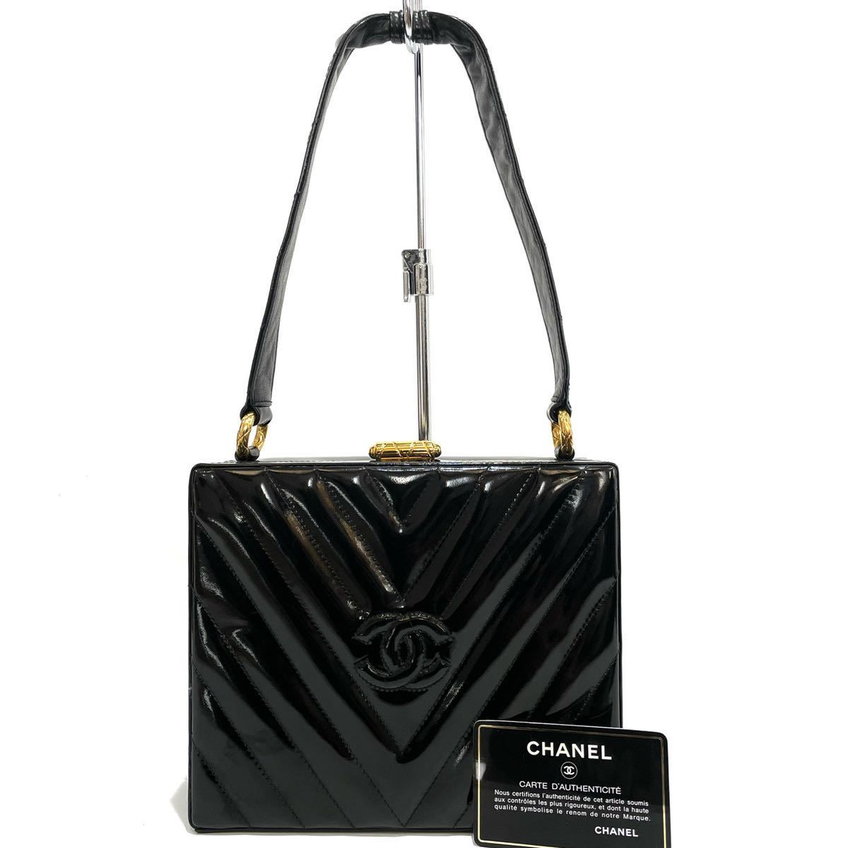 > 良品◆レア!!Vintage CHANEL Vステッチ シェブロン パテント レザー がま口 ボックス ワンショルダーバッグ セミショルダー ブラック