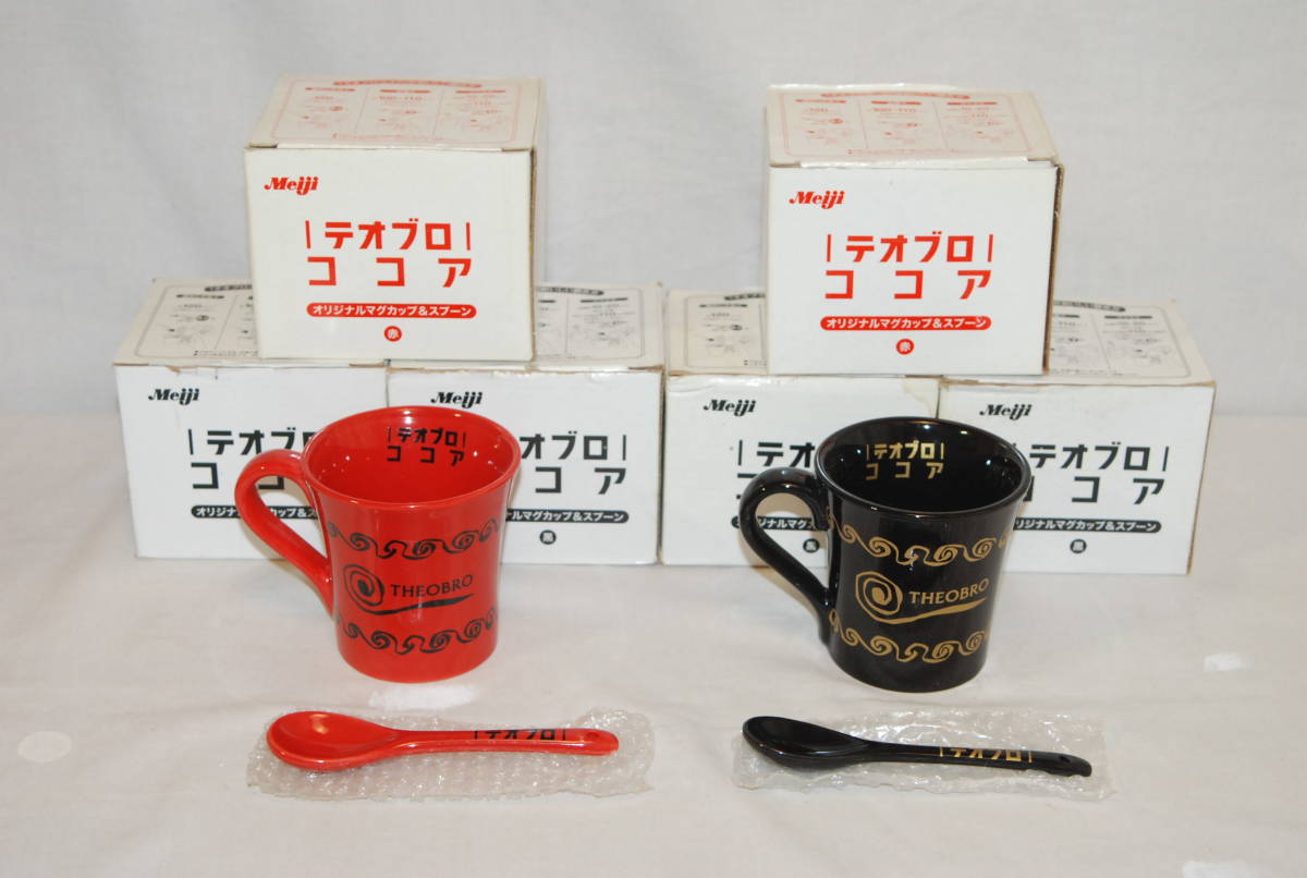 - 未使用品 明治 テオブロ ココア オリジナルマグカップ&スプーン 6個セット 黒4個 赤2個 おまけ 非売品 昭和レトロ