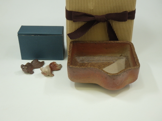 - h5D061Z25 備前焼 清水政幸 織部焼の本歌 向附/清水弥生 金魚 箸置 2点