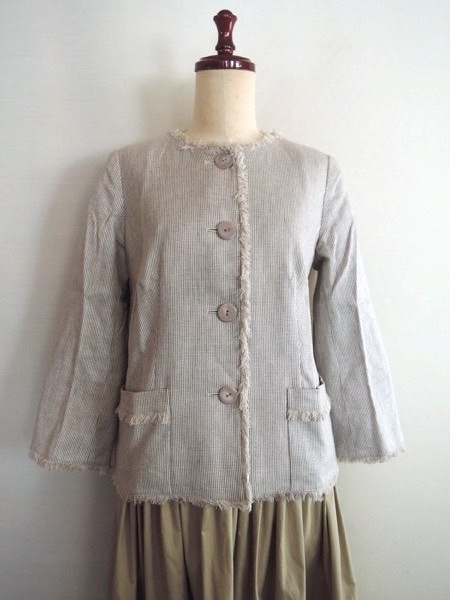 - yoshie inaba ヨシエ イナバ 麻混 フリンジ ノーカラージャケット 羽織 裏地シルク 9号