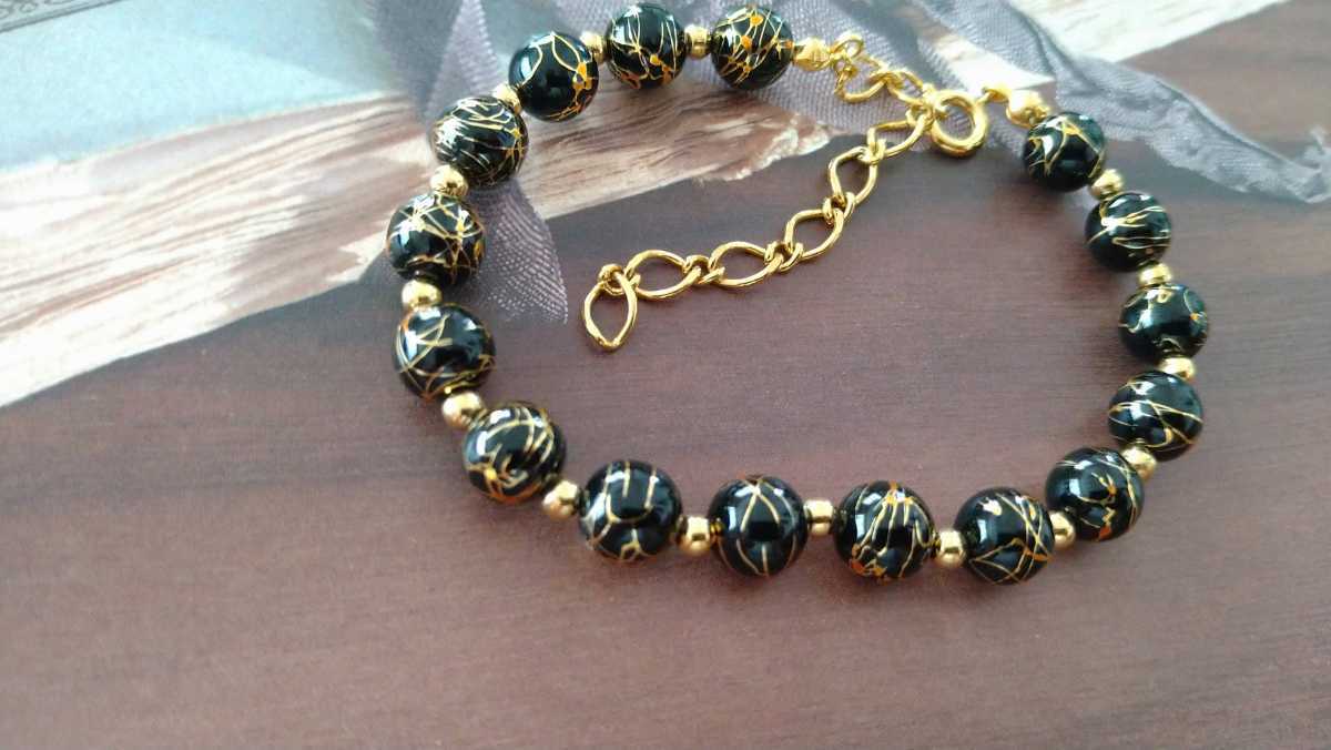 - □黒×ゴールドカラー□模様入りビーズ・ブレスレット□
