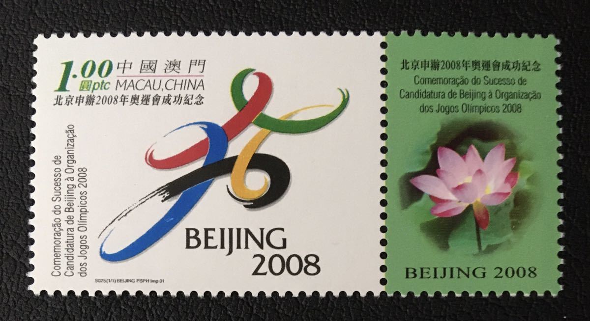 - 中国マカオ 2001年 北京五輪誘致 オリンピック 花 タブ付1種完 未使用 NH