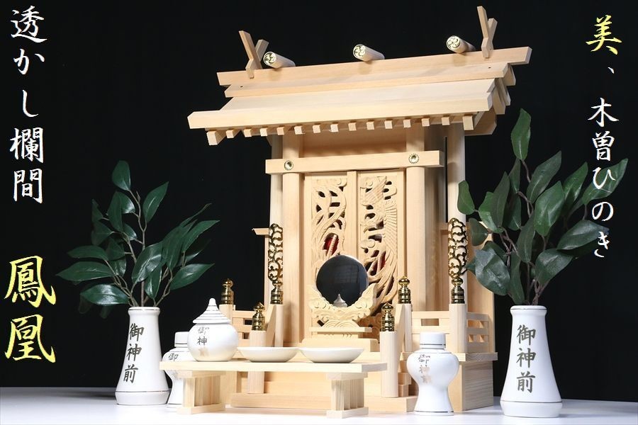 - 鳳翔一社・大 ■ 美・木曽ひのき■ 大神明 ■ 鳳凰の彫刻に赤御簾 特大型 神棚 神具付 神棚セット
