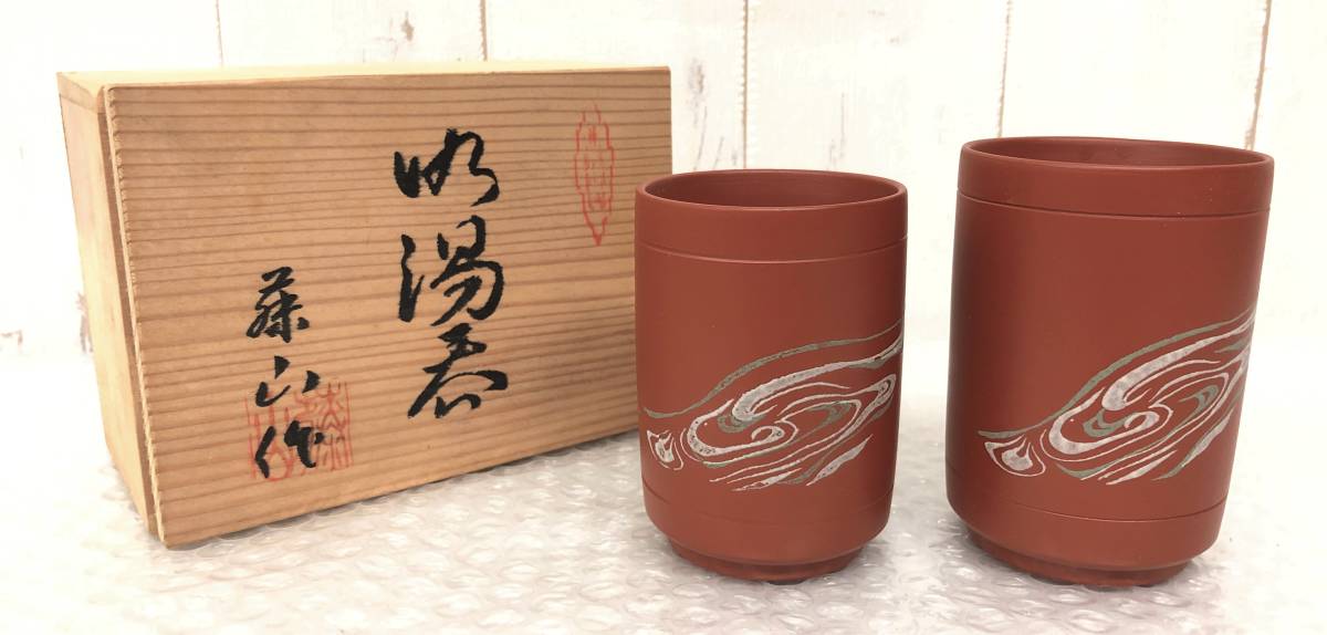 - 伝統工芸 工芸品 工芸美術 *常滑焼 藤山作 藤山 朱泥 夫婦 湯呑 ゆのみ コップ *波紋 文 60mm×90mm 57mm×80mm *外箱 木箱 共木箱 入り