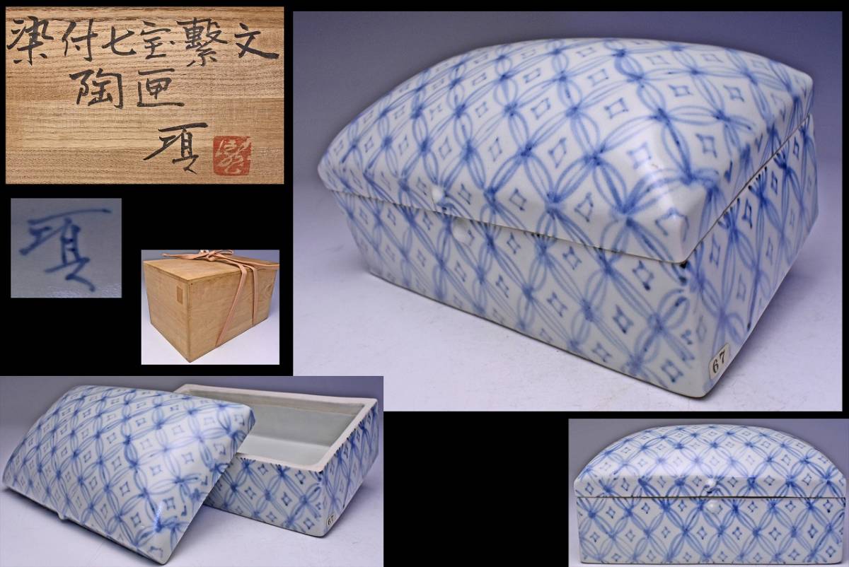- 瀧田項一 ★ 染付七宝繋文陶筥 ★ 共箱 ★ 富本憲吉 瀧田史宇 盒子 蓋物