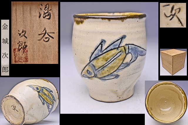 > 金城次郎 ★ 魚文 湯呑 ★ 共箱 ★ 人間国宝 ★ 細めライン!の希少手 ★ 壺屋焼 三人男 新垣栄三郎 小橋川仁王 ★ 沖縄 民芸 ★