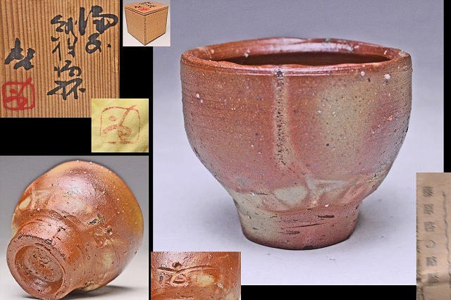 > 藤原啓 ★ 備前 緋襷 ぐい呑 ★ 共箱 共布 栞 ★ 人間国宝 ★ 氏らしい造形に緋色が美しい逸品 ★ 酒器 ★ 検 藤原雄 藤原建 藤原和