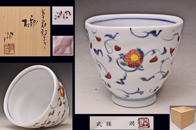 - 武腰潤 ★ 九谷 色絵 草文繋ぎ 椀 ★ 共箱 共布 栞 ★愛らしい絵付の逸品 ★ 検 湯呑茶碗 泰山窯 ★