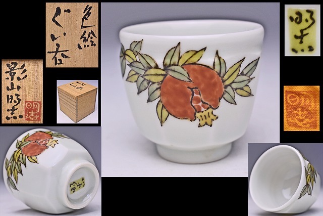 > 影山明志 ★ 色絵柘榴文ぐい呑 ★ 共箱共布 ★ 師: 人間国宝 藤本能道 ★ 面取り