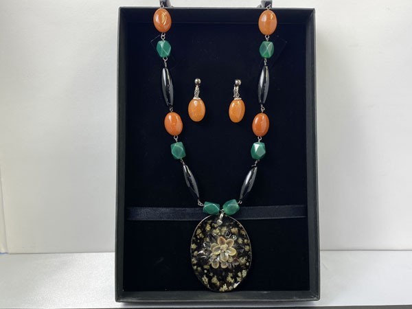 - ブラック系 花のモチーフ◇石 アクセサリー ネックレス イヤリング 2点セット◇カジュアル◇A-0024