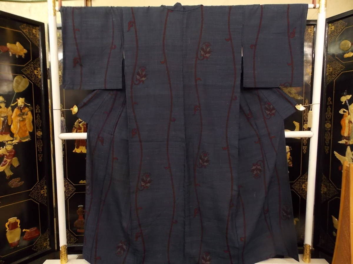 - きもの今昔3039 正絹紬単衣きもの 紺色地臙脂色の蔓花柄
